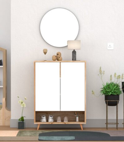 White & Cherry Pine Modern Multi-Shelf Wooden Shoe Cabinet, Dual Door Design – Ideal for Entryway or Living Room Storage, Multiple Compartments for Organizing Footwear and Accessories, Color: Multi