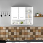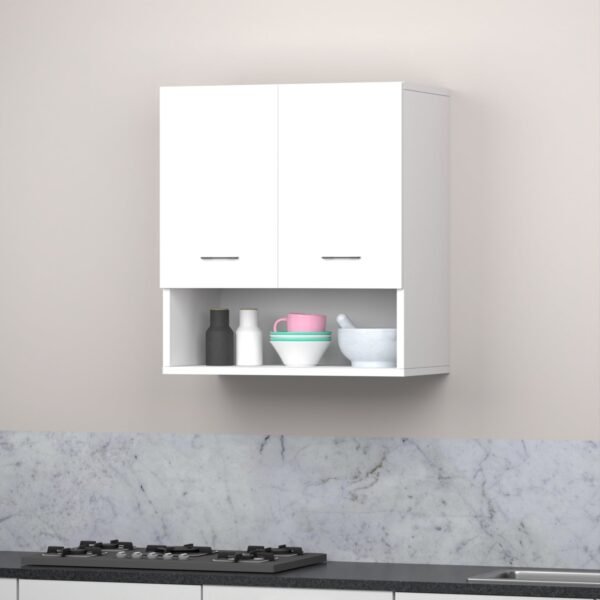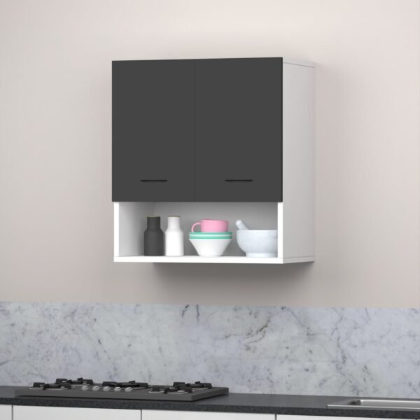 Features a combination of open shelves and two-door closed cabinets to store a variety of kitchen essentials like jars, cups, spices, and decorative items.