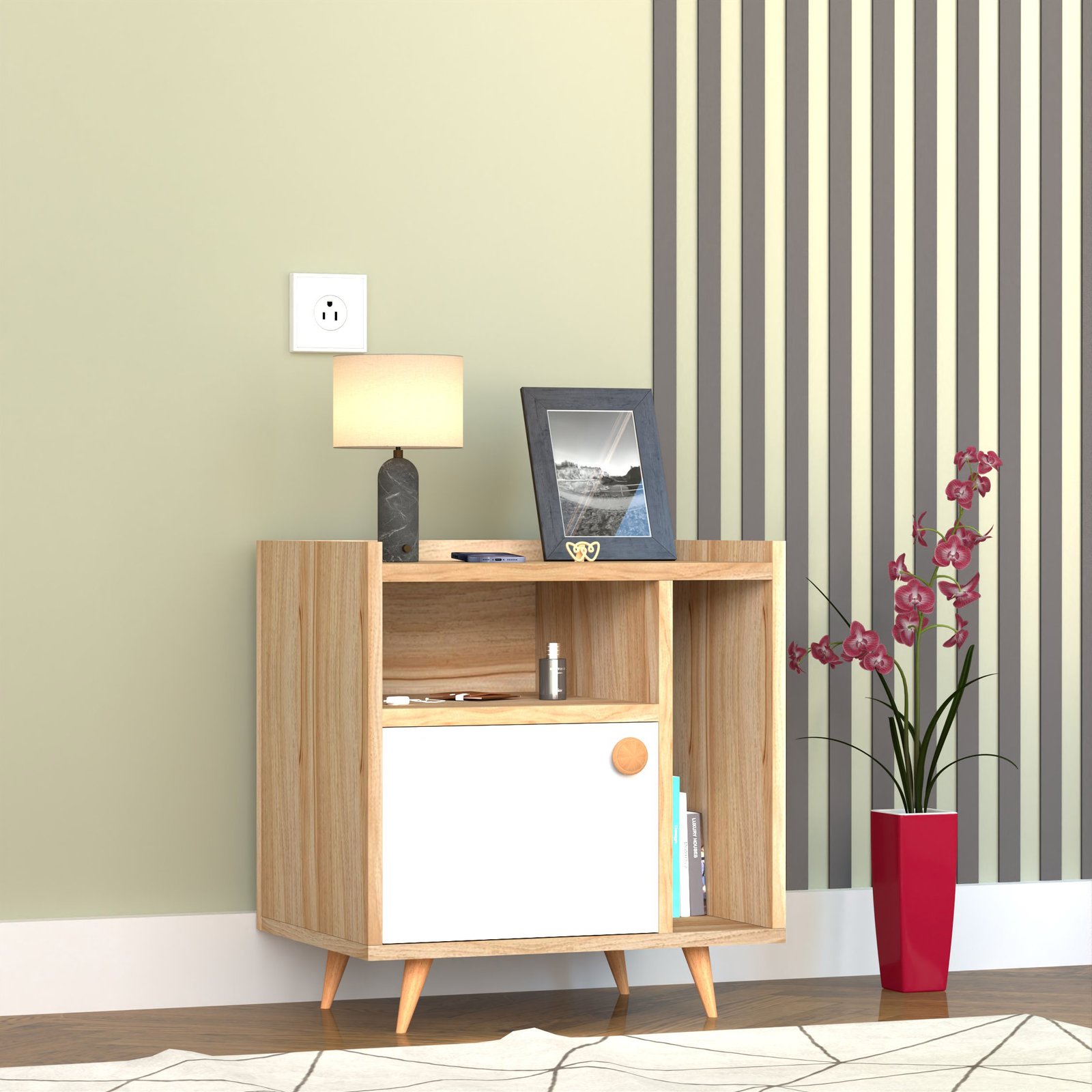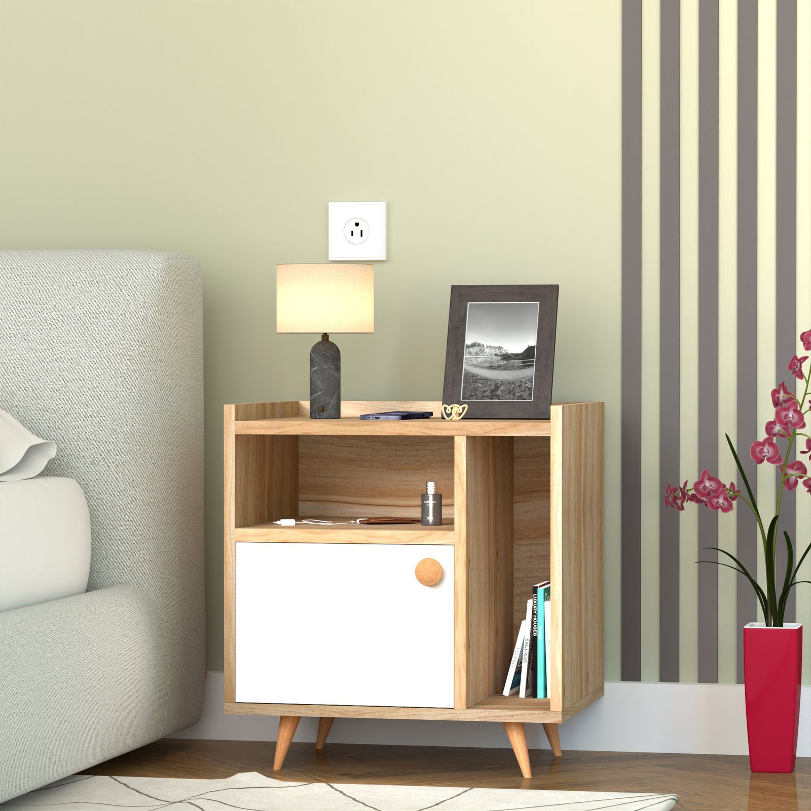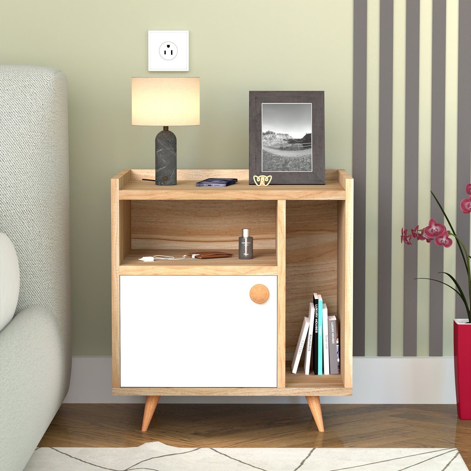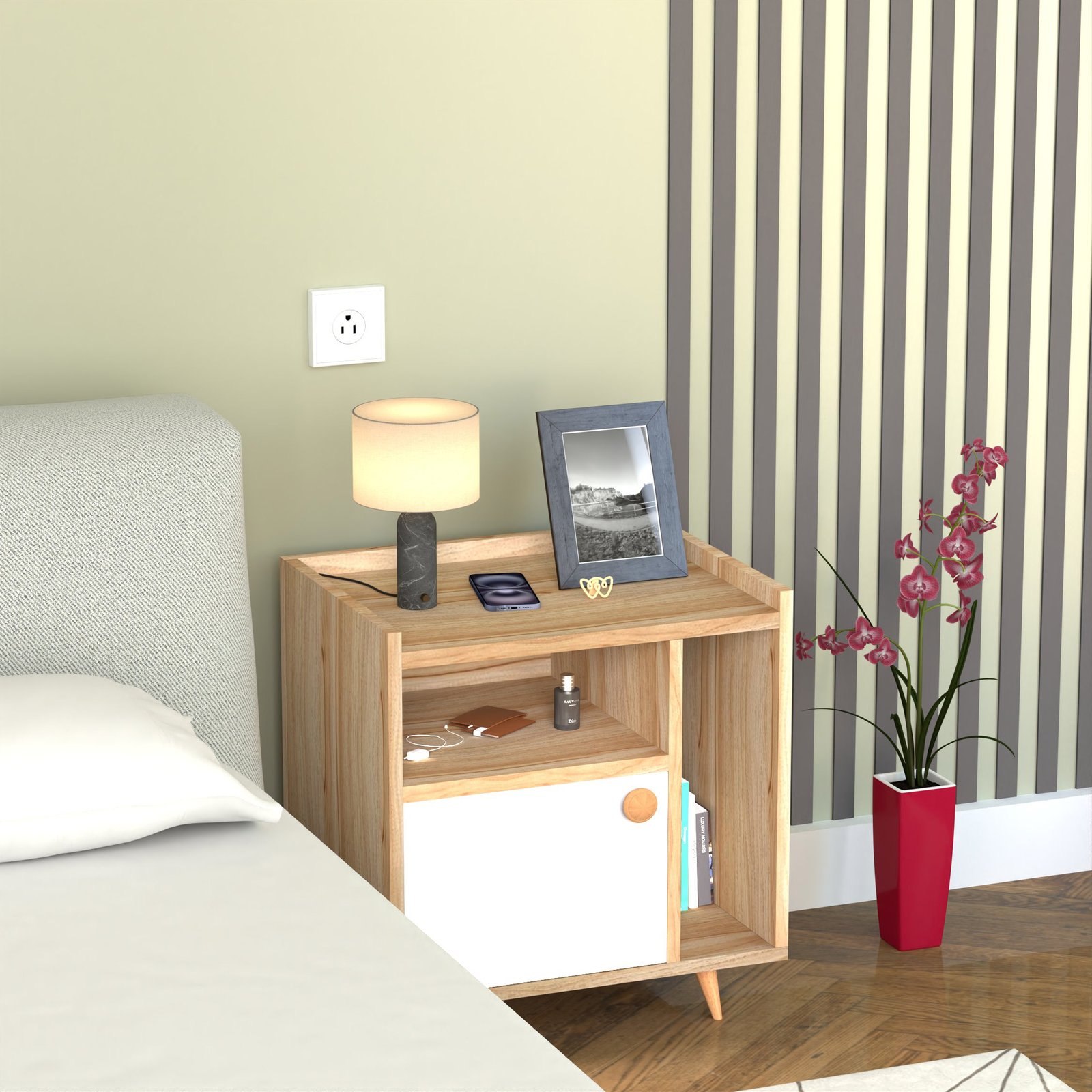 - A closed cabinet with a sleek white door hides away clutter such as chargers, personal items, or accessories.