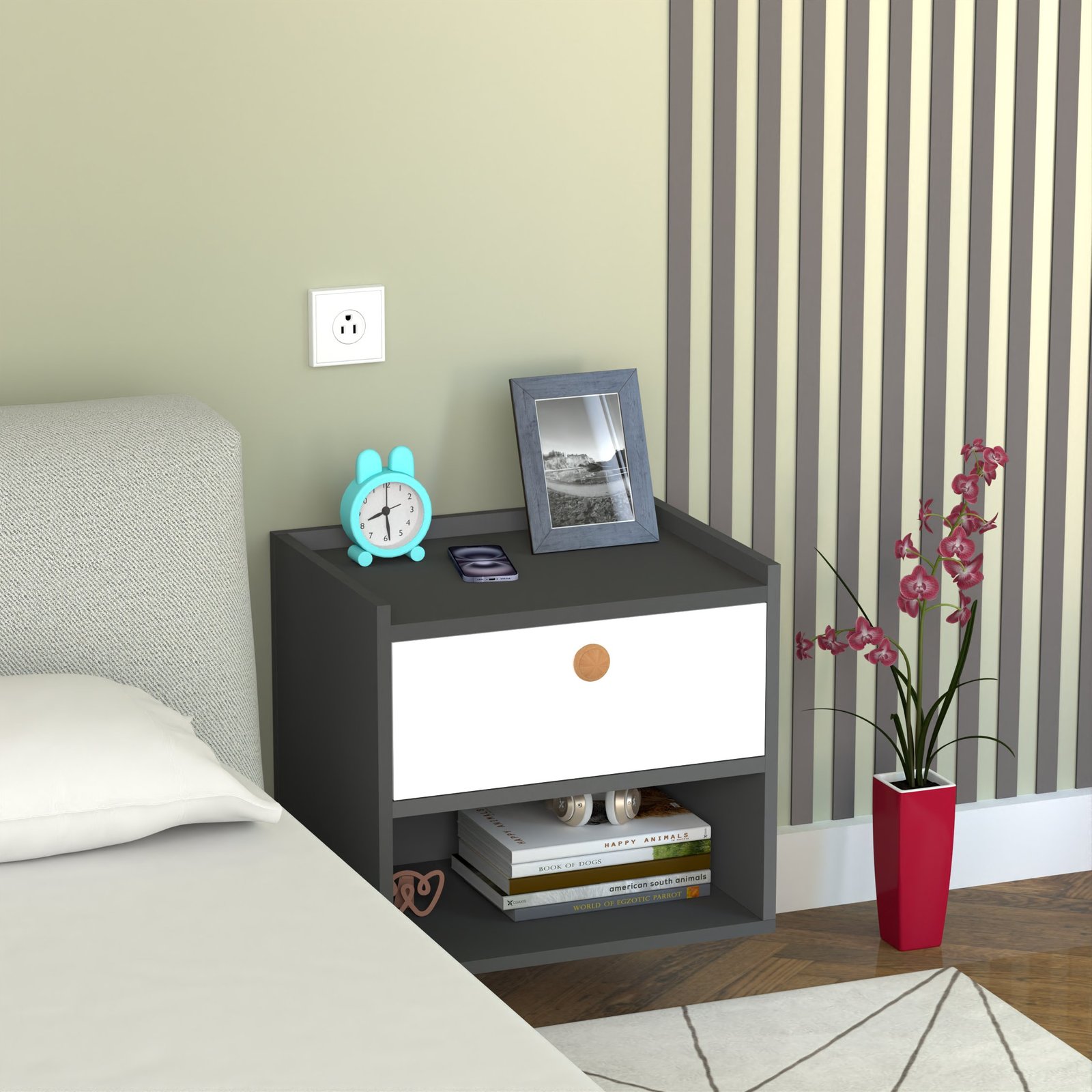 Modern bedside table with durable engineering wood, featuring an open shelf for books, a vertical magazine slot, and a closed cabinet for storing essential items.