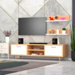 This modern white media console includes a wall-mounted TV unit, two floating shelves, and a spacious base cabinet. It combines functionality with minimalist elegance, perfect for enhancing your living room décor.