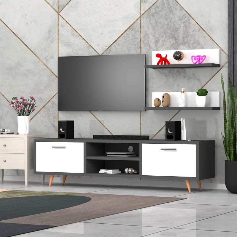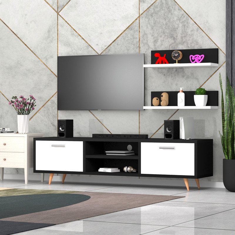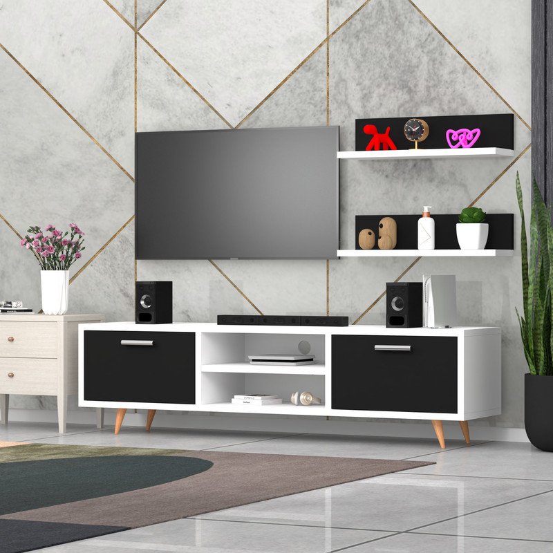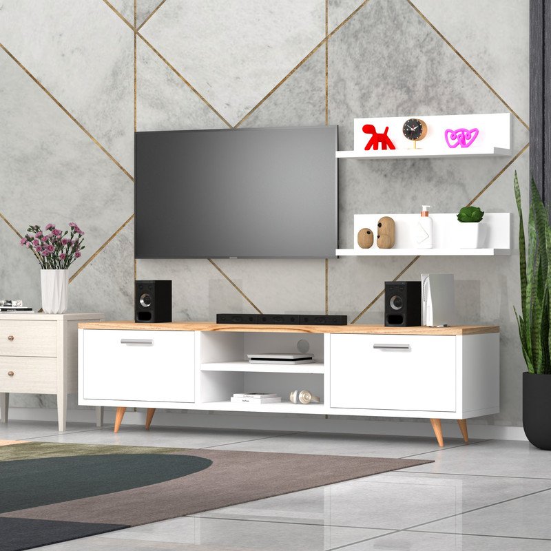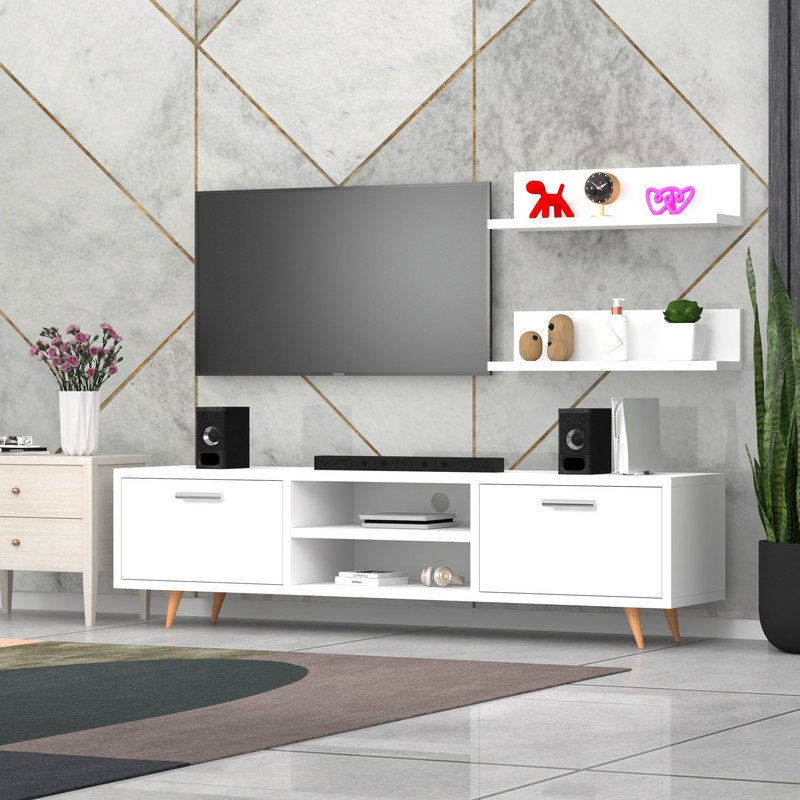 This modern white media console includes a wall-mounted TV unit, two floating shelves, and a spacious base cabinet. It combines functionality with minimalist elegance, perfect for enhancing your living room décor.