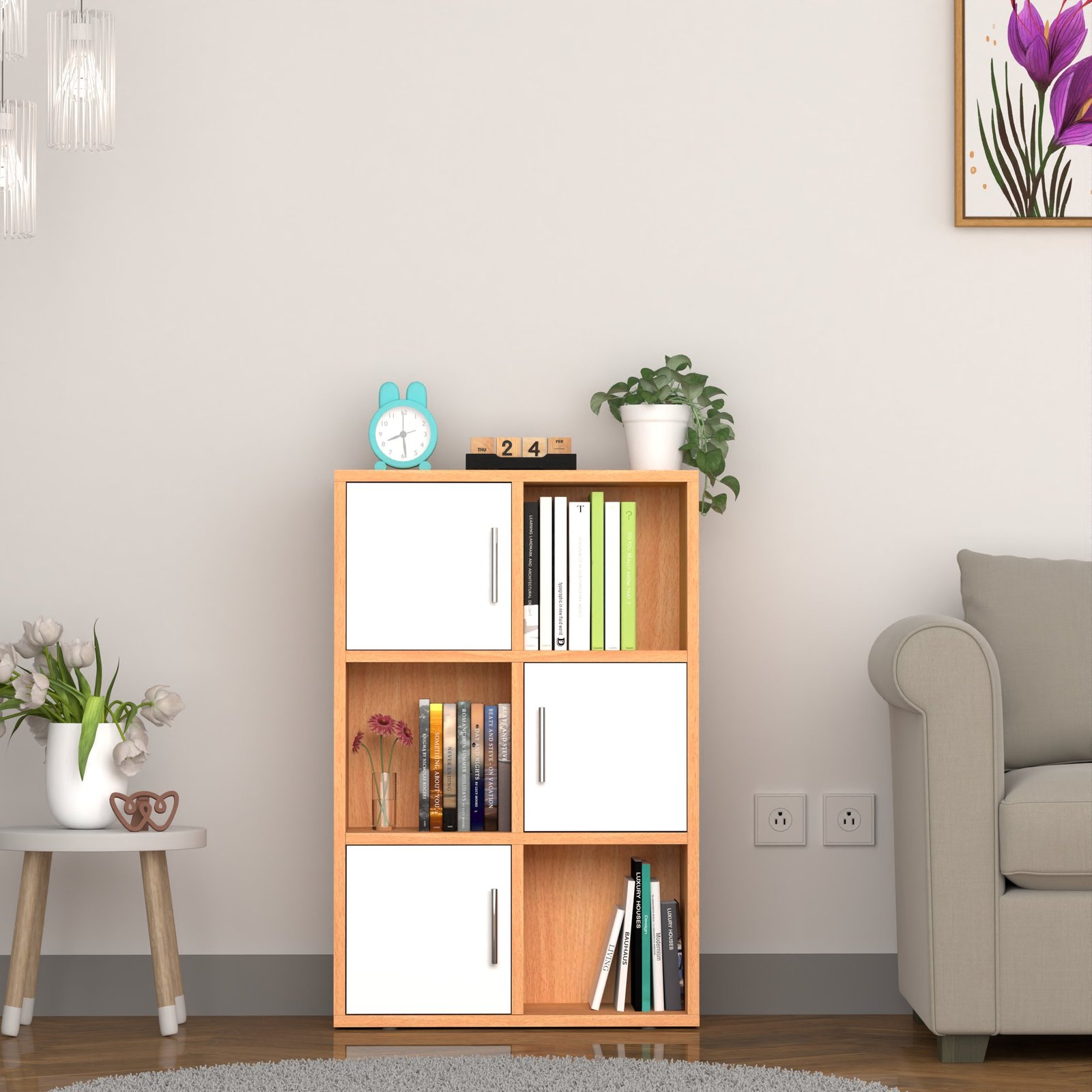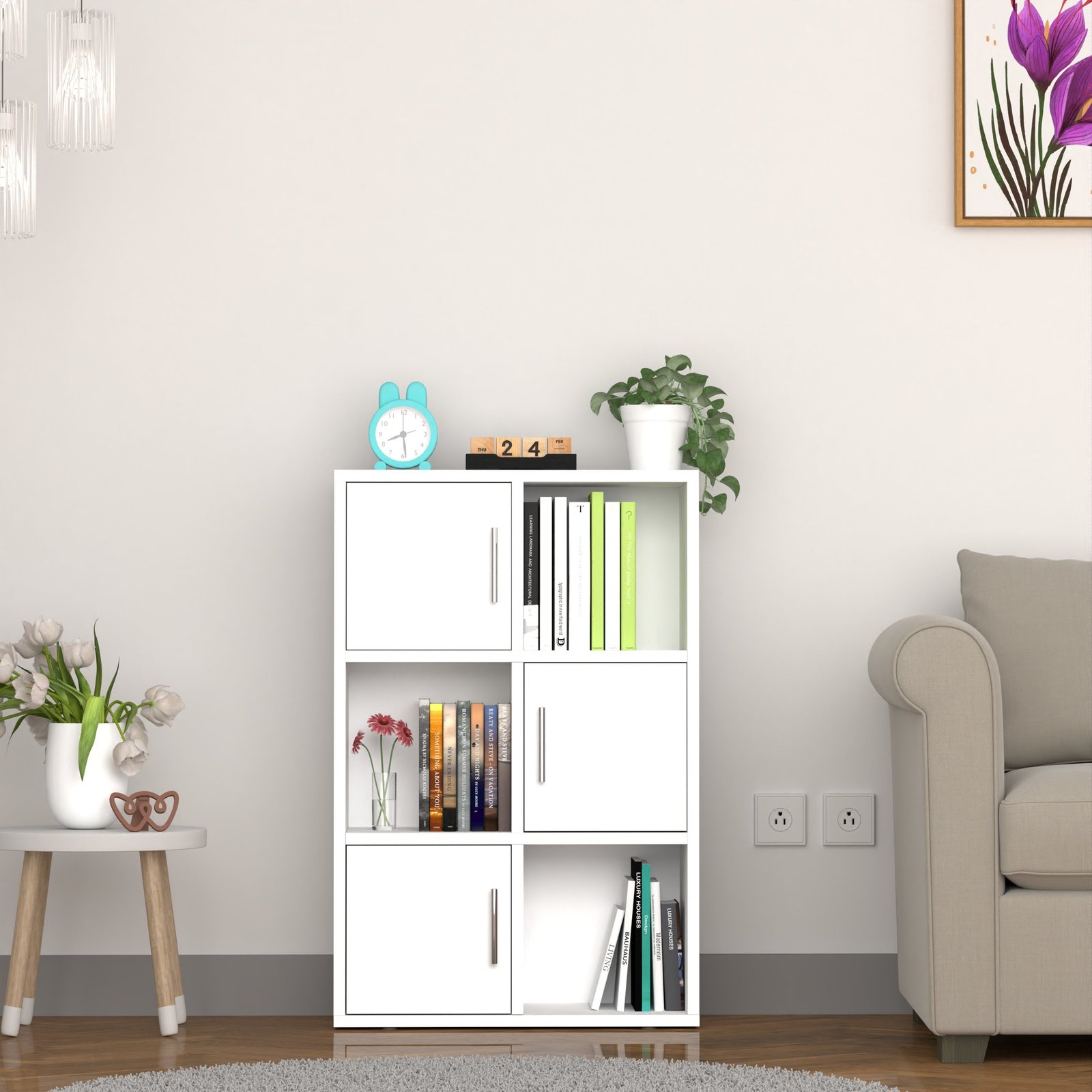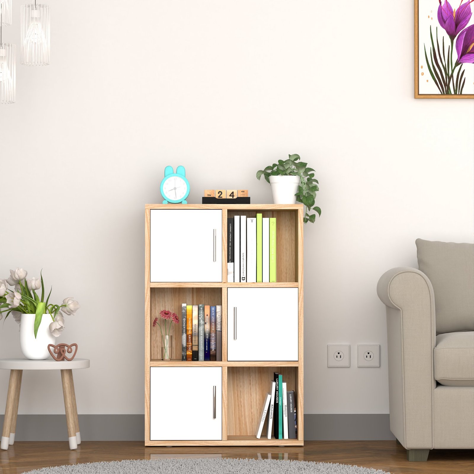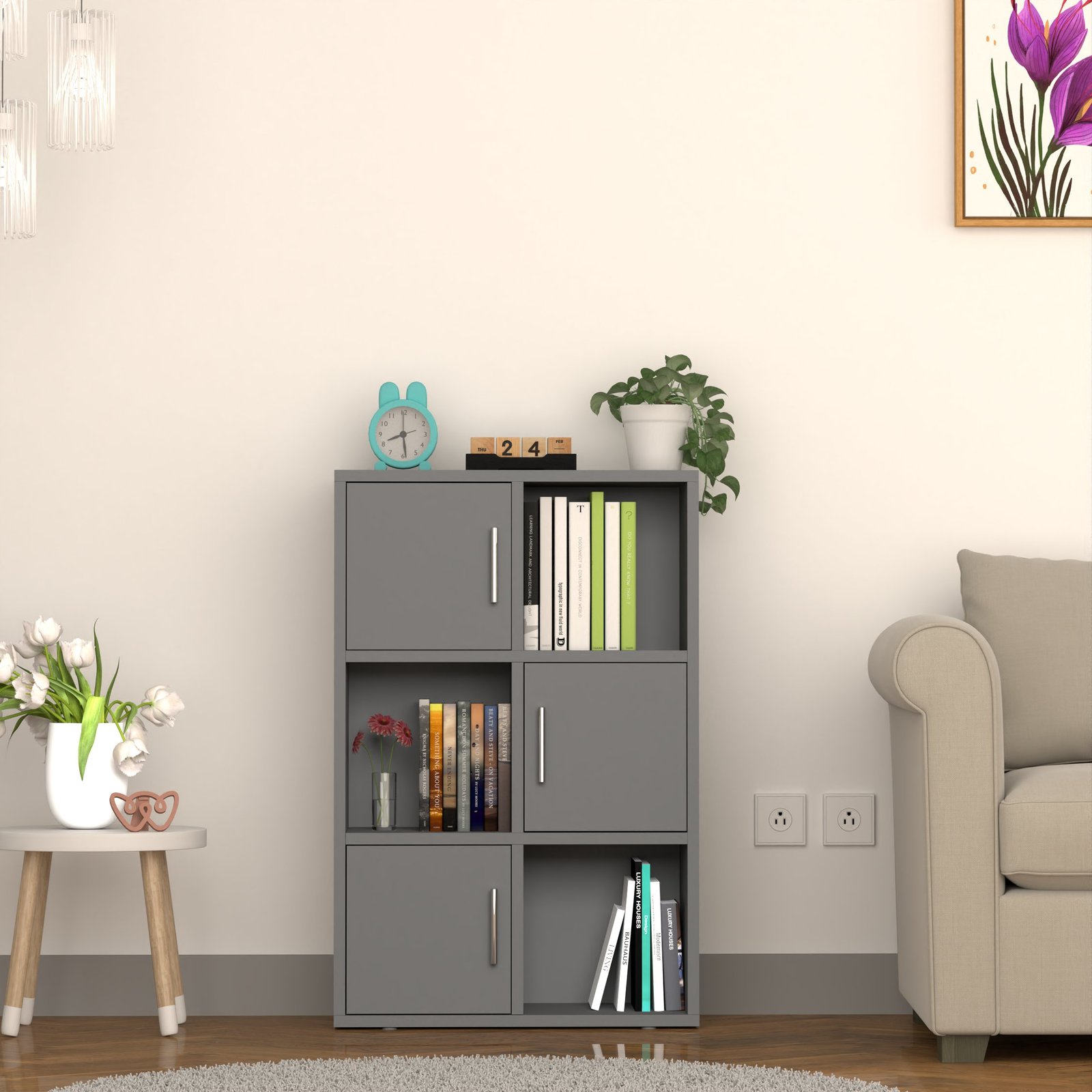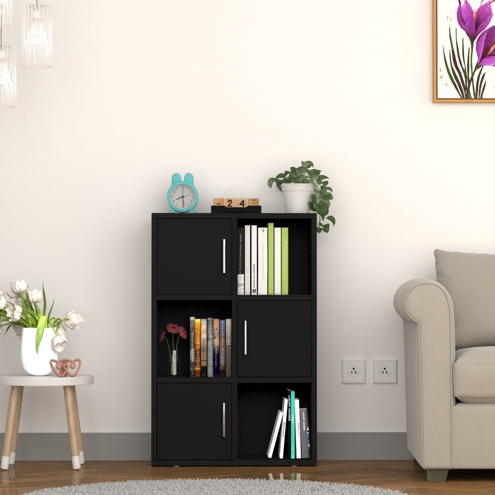 The unit includes six compartments—three open shelves and three enclosed cabinets. This setup offers flexible storage for books, documents, decorative items, and everyday essentials.