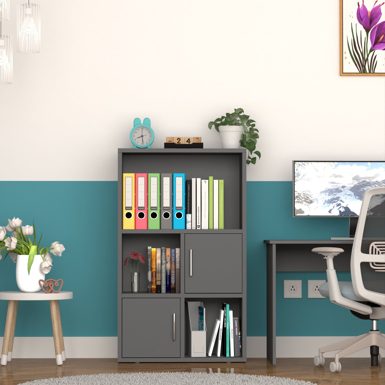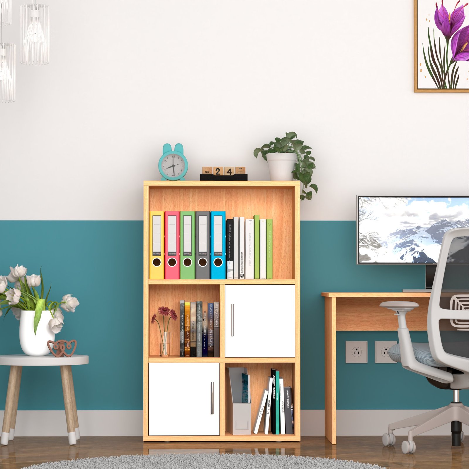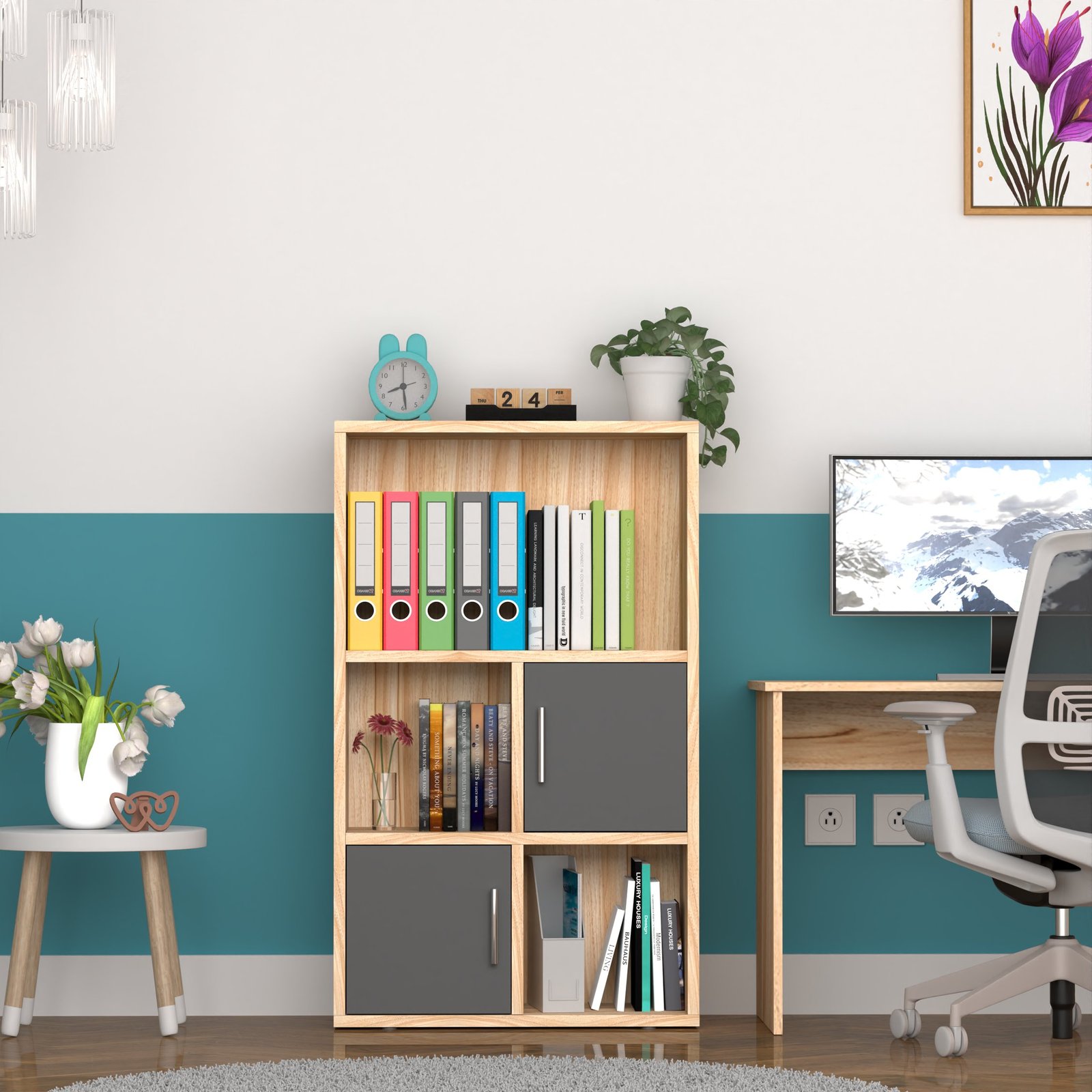 With two open shelves and two closed-door cabinets, this bookshelf offers both display and concealment. Show off books, plants, or decor, while storing electronics, files, or supplies neatly out of sight.