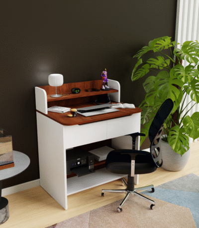 White & Asian Light Modern Compact PC Table with Open Storage & Drawer